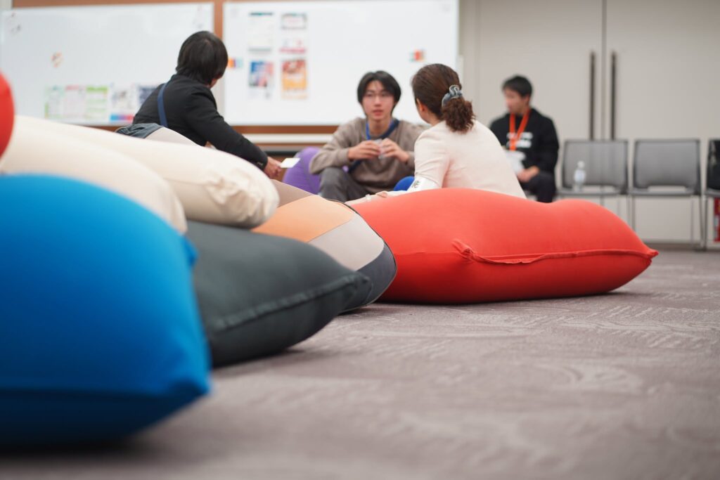 Yogiboは、参加者が肩の力を抜いて対話できる環境づくりを通じて、社会課題解決に取り組む人々が集うこの場で、参加者同士の交流が自然に生まれる環境づくりに寄り添いました。
