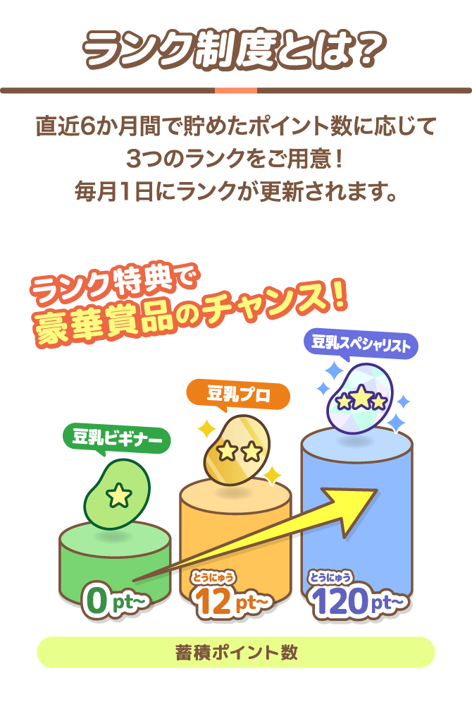 本キャンペーンは、直近6か月間に貯めたポイント数に応じて、「豆乳ビギナー」「豆乳プロ」「豆乳スペシャリスト」の3つのランクが設定される制度です。