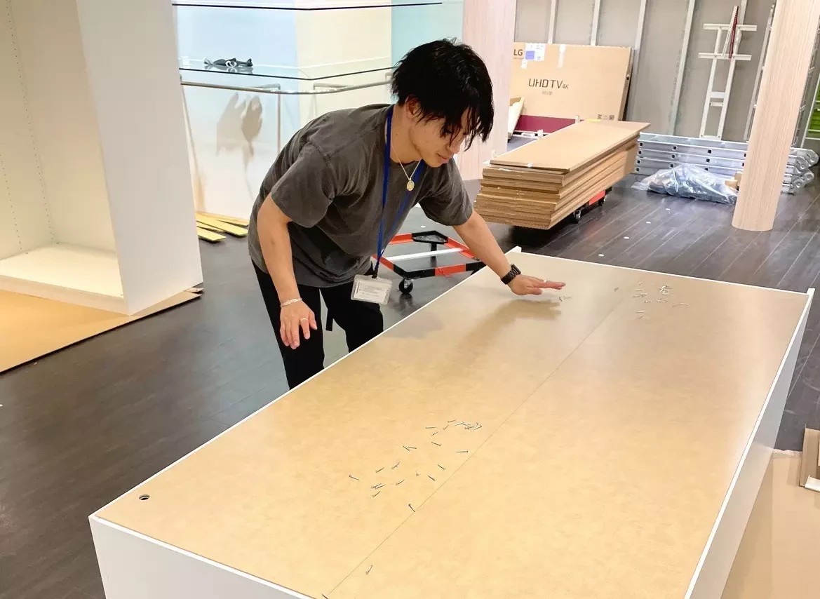 店舗設営作業では、何もない商業施設のブースに、棚(什器)を作って設置したり、壁紙を貼ったり、商品の搬入、陳列作業を行い、Yogibo Storeをオープンできる状態に作り上げます。