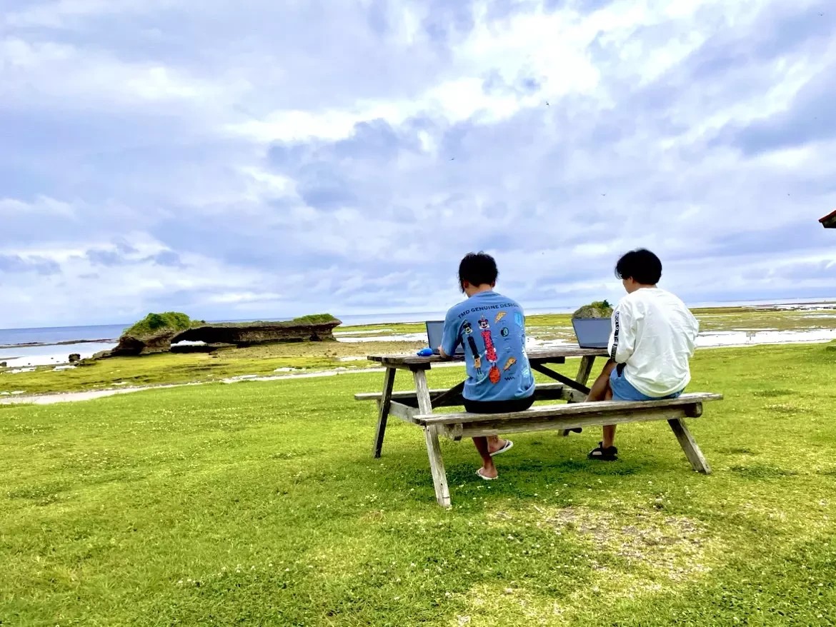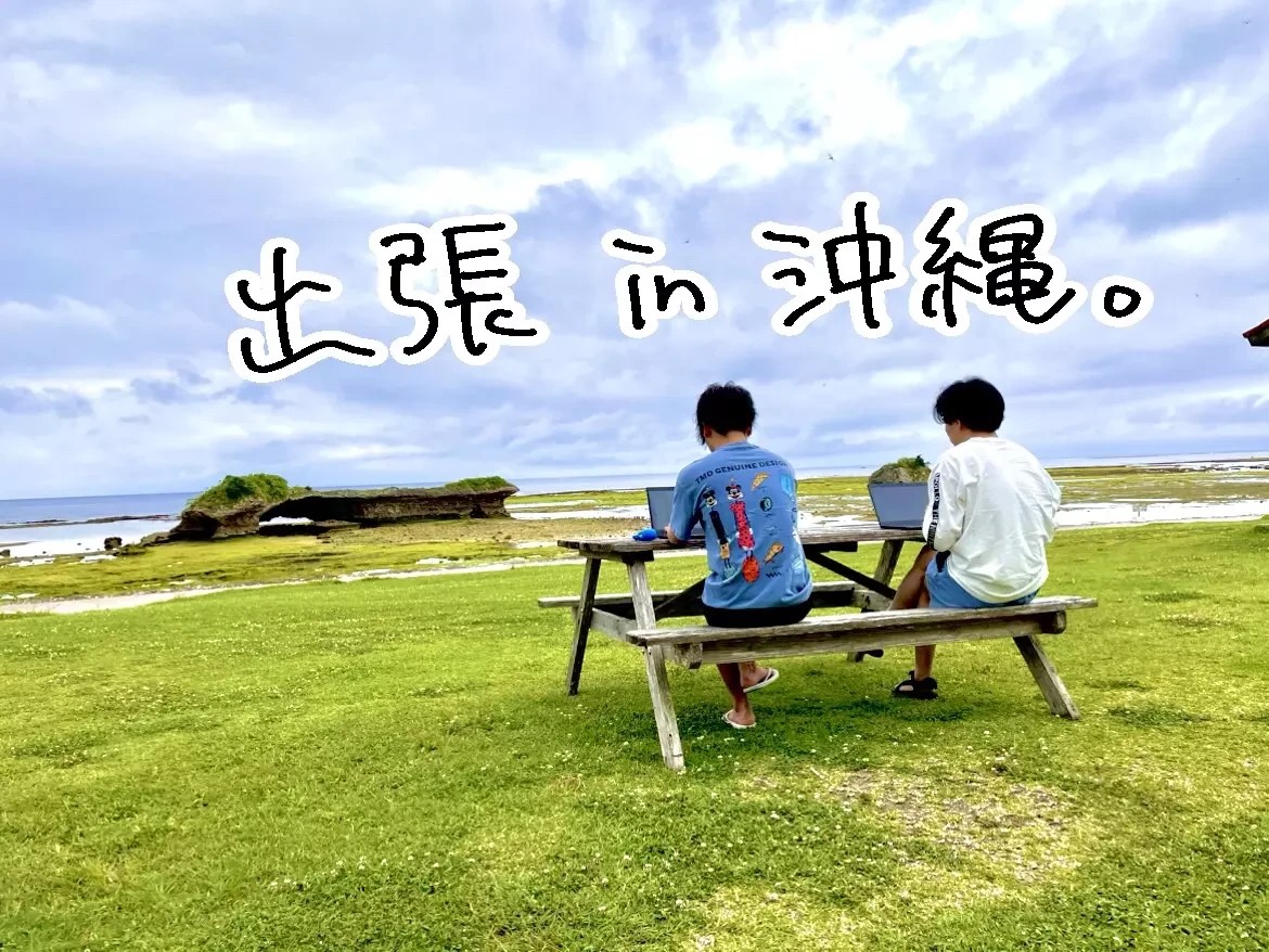 写真は沖縄出張に行った際に、草原でリモート会議に参加している様子です。